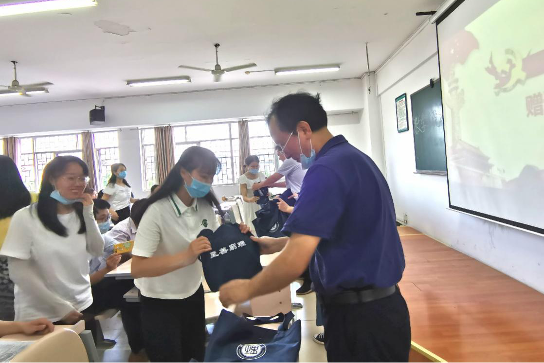 随后,孙明保同志和易政群同志为全体毕业生全员赠送行囊。行囊里有一本党费证,一本党章,一本《大国精神》及一份倡议书。行囊是学校对各位毕业生党员最后的叮咛,激励他们不忘初心,牢记使命,勇往前行。各位毕业生党员双手接过行囊,脸上洋溢着灿烂的笑容,纷纷表示定不辜负学院寄予的厚望。