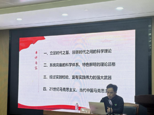 在随后的专题党课环节,江五元书记以《深入学习贯彻习近平新时代中国特色社会主义思想》为题,为全体与会人员带来了一场内涵丰富、启迪深刻的专题辅导。江书记通过生动案例和严谨论述,系统阐释了习近平新时代中国特色社会主义思想的时代背景、核心要义与实践要求,并紧密结合数学学科特点与学院发展实际,就如何将党的创新理论融入学业发展、科学研究和日常生活提出了具体指引。他勉励全体学生党员和入党积极分子要筑牢信仰根基,提升政治素养,勇担时代使命,努力成长为德才兼备的社会主义建设者和接班人。
