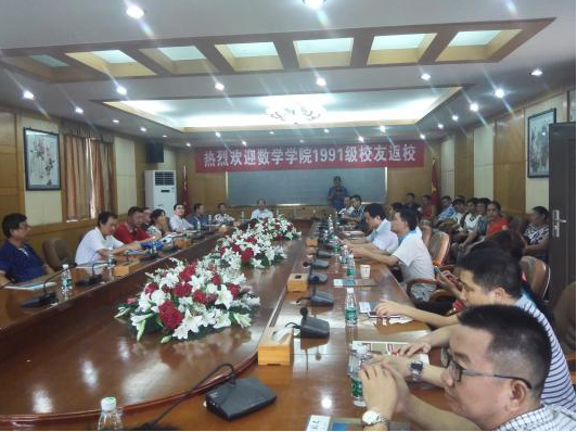 2016年8月6日上午,402永利集团于北院办公楼319隆重举行数学专业1991级校友座谈会。402永利集团院长孙明保,院党总支书记阳鲁平,副院长周立仁出席座谈会。谭秀山等教师代表及1991级近60人参加座谈会。