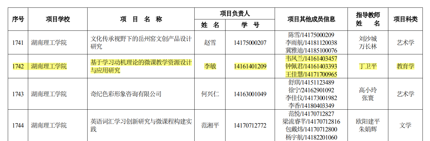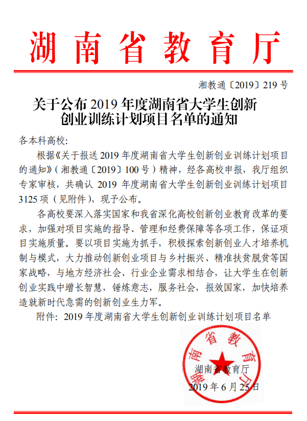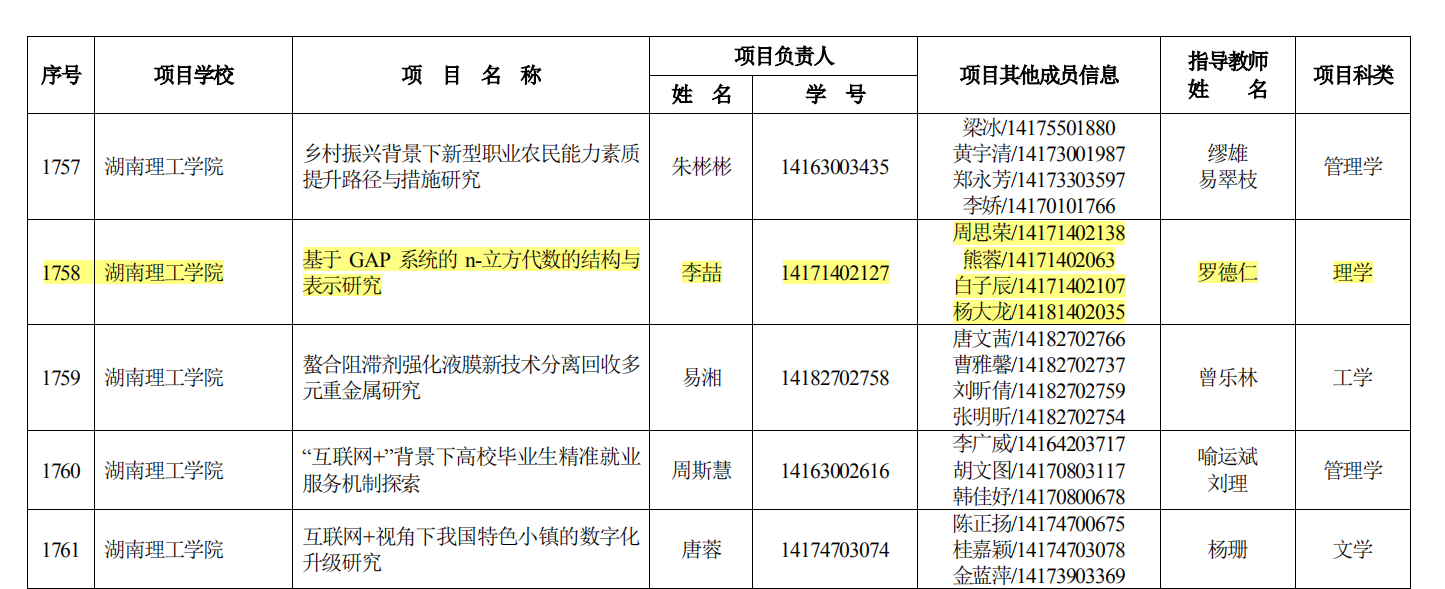 湖南省教育厅6月25日发布“湘教通〔2019〕219号 402永利集团公布2019年度湖南省大学生创新创业训练计划项目名单的通知”,我院数学16-2BS学生李敏同学申报的“基于学习动机理论的微课教学资源设计与应用研究”(项目指导老师丁卫平)和数学17-1BS学生李喆同学申报的“基于 GAP 系统的 n -立方代数的结构与表示研究”(项目指导老师罗德仁)获得立项。