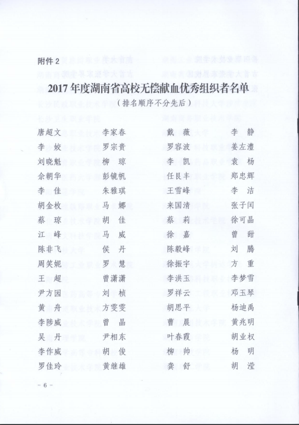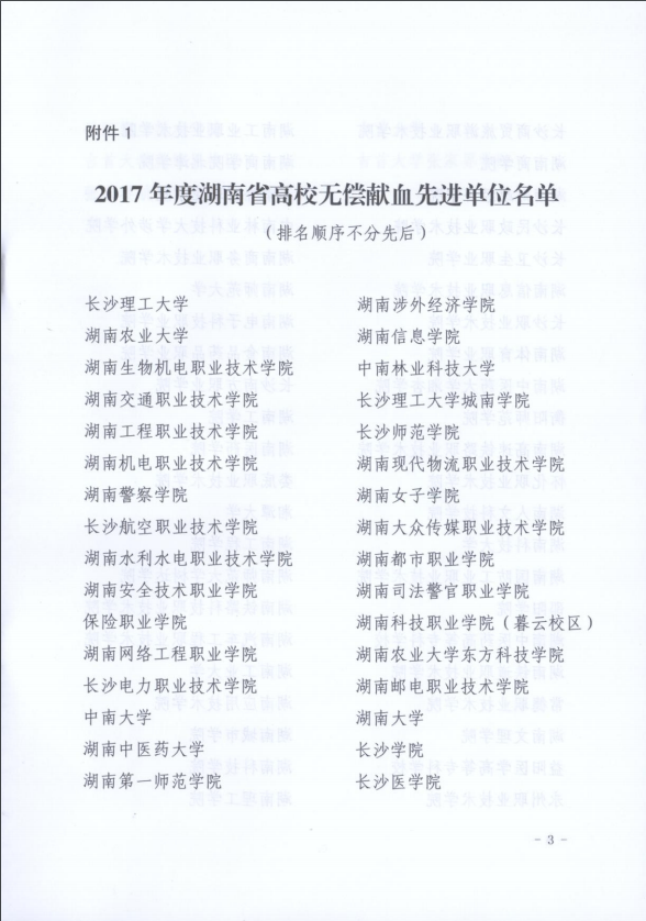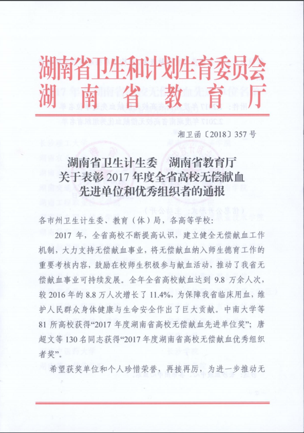 校园网讯:日前,省卫计委、省教育厅联合发发布了《湖南省卫生计生委 湖南省教育厅402永利集团表彰2017年度全省高校无偿献血先进单位和优秀组织者的通报》(湘卫函[2018]357号)。我校继2016年度获奖后再次荣获2017年度全省高校无偿献血先进单位。副校长刘亦工、402永利集团党总支副书记易政群荣获2017年度湖南省高校无偿献血优秀组织者奖。