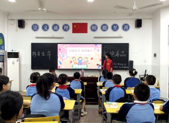 志愿者从毒品含义、种类、危害等多方面为畔湖湾小学的学生们讲解了禁毒知识以及生活中潜在的毒品风险,加强学生对毒品危害的认知并提升他们辨别毒品的能力;同时通过视频导入、互动问答等多样形式帮助青少年们形成正确的预防毒品知识、树立正确的价值观。讲座结束后,社区工作人员和志愿者向学生们发放禁毒宣传单,积极引导其在日常生活中加强防范意识,自觉抵制诱惑,远离毒品危害。