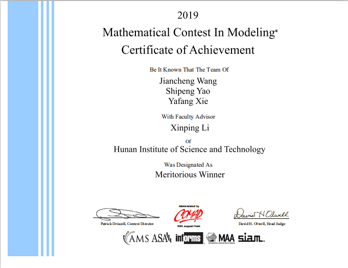 日前,2019年美国大学生数学建模竞赛与交叉学科数学建模竞赛(MCM/ICM)成绩揭晓,402永利集团首次组队参加,李新平、何帆、彭定忠等老师指导的参赛队伍全部获奖,其中李新平老师指导的队伍荣获国际一等奖1项,今年全球获奖率一等奖仅6%。