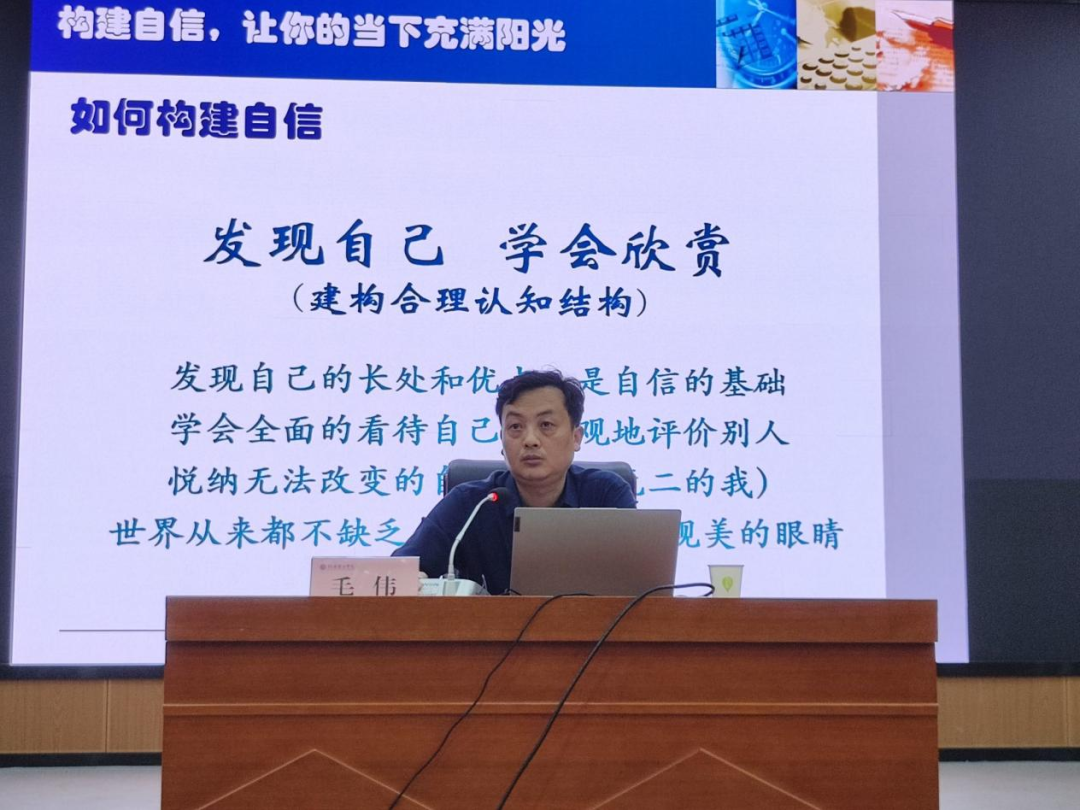 本次讲座毛伟从学会适应、构建自信、提升能力、真心相待四个方面为同学们进行心理健康指导。他提到:“世界从来都不缺乏美,而是缺少发现美的眼睛”,告诉每一位学生都要学会发现自己和他人的优点,客观全面的认识自我和懂得欣赏他人。同时,毛伟提出大学生需要提高的九大能力及“人际交往白金法则”,告诫同学们要尊重他人,宽容待人,学会沟通,提高自己的人际交往能力。此外,他还用数个事例告诉同学们在大学里要树立明确的目标,规划自己的人生。会议最后,毛伟祝愿全体新生们拥有一个美好而充实的大学生活。