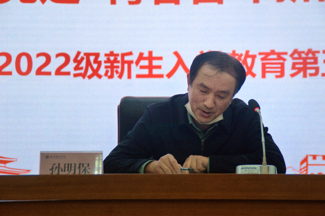 司念伟立足于“团史:中国共产党缔造了中国共青团”,将共青团的诞生和发展按照时间进行顺序详细介绍,让同学们明白共青团的诞生与蓬勃发展离不开党,告诫青年要时刻听党话,感党恩,跟党走。“团情:党有号召,团有行动的时代需求”方面,司念伟引用习总书记对青年的讲话,结合习总书记给予众多学生回信等事例,表现出习总书记对青年的认可与期待。同时,他又列举了时代楷模黄文秀,重庆火灾中的摩托骑手,戍边英雄等事件,肯定了青年带来的价值,希望大家能成为“有理想、敢担当、能吃苦、肯奋斗”的新时代好少年。从“团务:为党育人、心系青年的理工实践”出发,司念伟介绍了我校于团党教育建设中付出的行动,并表示校团委积极参与青年马克思主义者培养工程,团校培训,青年大学习,团学骨干教育培训,让大学生志愿服务西部计划,青年志愿服务,社会实践,努力让团属培训成为令人向往的课程,让团属阵地成为令人向往的家园,让团属荣誉成为令人向往的美好,让团属活动成为令人向往的远方。最后,孙明保教育全体新生作为大学生,要拥有一技之长,珍惜时间,以学业为重并多参加有意义的活动。