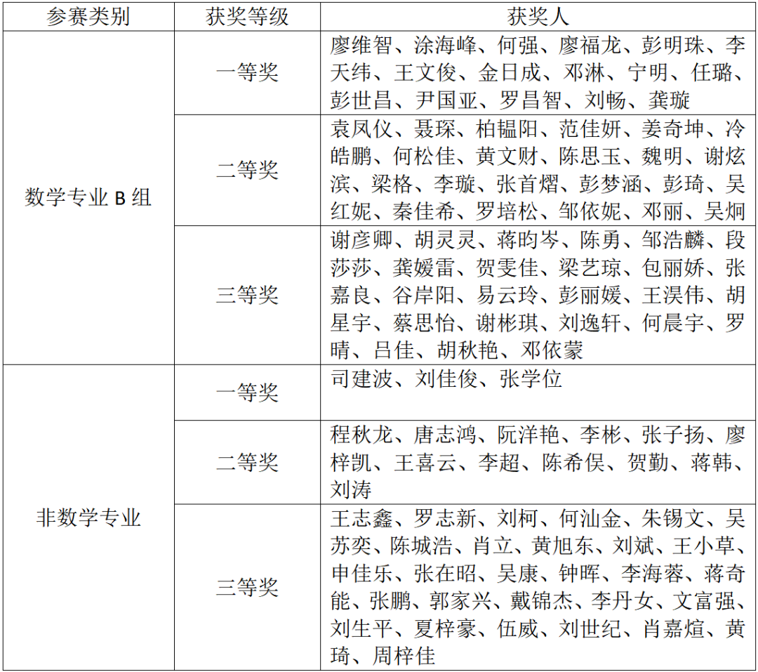 本站讯 12月21日,湖南省数学学会公示了2022年第十四届全国大学生数学竞赛初赛成绩。我校数学专业81名同学、非数学专业65名同学参赛,共有106名同学获奖。其中,专业组获省一等奖16项,二等奖22项,三等奖24项,获奖率76.5%,获奖率超省平均获奖率18个百分点,获奖项数占全省B类总数10%,一等奖获奖数占全省B类一等奖数量16.3%,一等奖数量及总获奖数量均排名B组全省第一。非专业组获省一等奖3项,二等奖12项,三等奖29项,获奖率超过省平均获奖率8.8个百分点。黎丽梅、蒋艳老师获湖南省大学生数学竞赛指导老师称号。获奖总数和一等奖获奖数创我校历年最高。